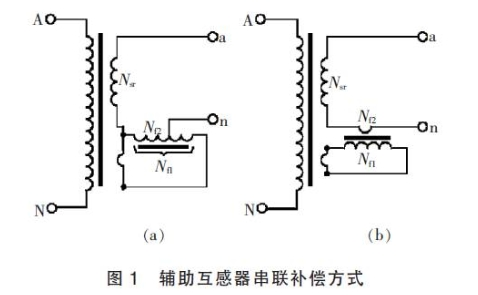 由主電壓互感器低壓側只需一匝的輔佐繞組給輔佐電壓互感器供電,接線原理圖如圖1所示,將這種補償辦法稱作串聯補償。